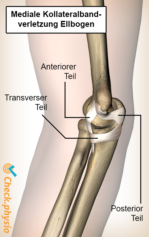 Das innere Band ist das ulnare Kollateralband. Es besteht aus 3 kleineren Bündeln, die für die seitliche Stabilität sorgen. Dies ist von großer Bedeutung bei Wurfbewegungen oder anderen Überkopfsportarten.
